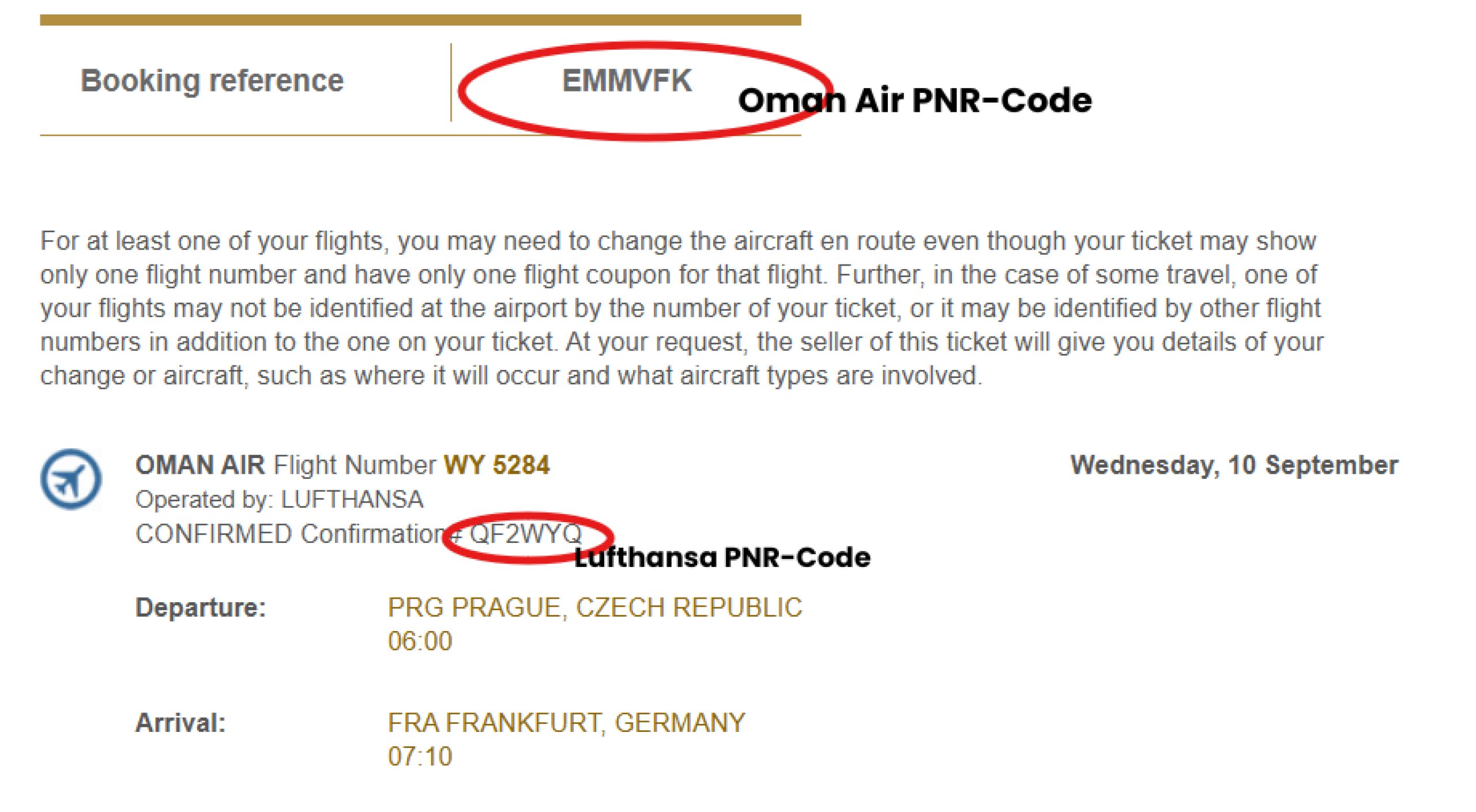 Alle Flüge wurden als eine Buchung gebucht, aber der Lufthansa-Flug von Prag nach Frankfurt hatte einen anderen PNR-Code als der Oman Air-Flug von Frankfurt FRA über Muscat MCT nach Sansibar ZNZ.