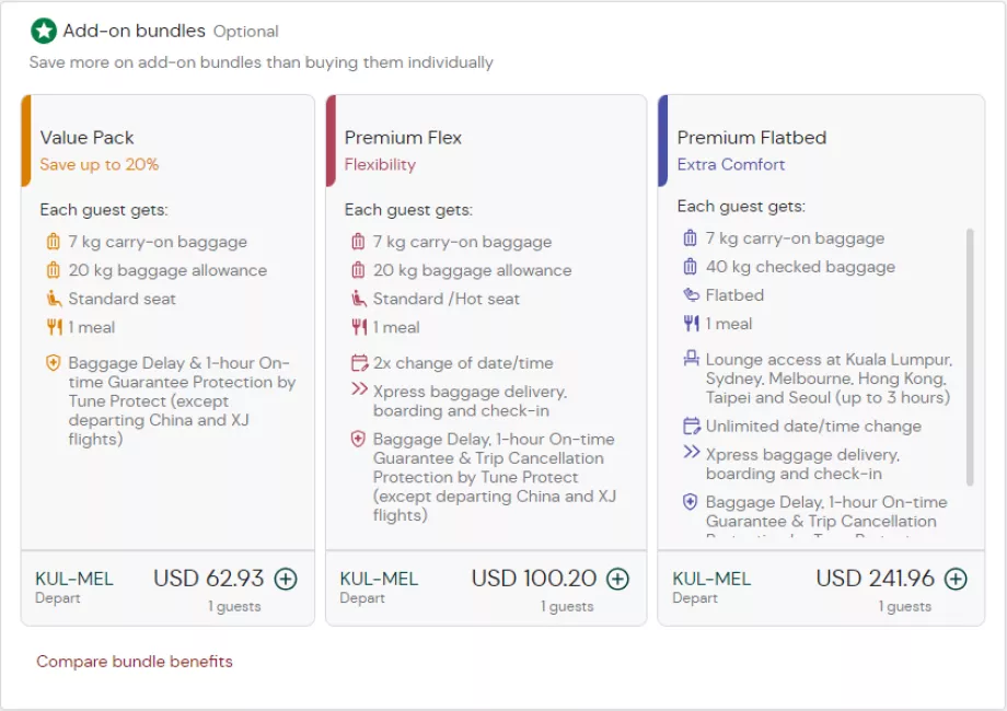 - Value Pack - Extra aufgegebenes Gepäck, Sitzplatzwahl, Mahlzeiten