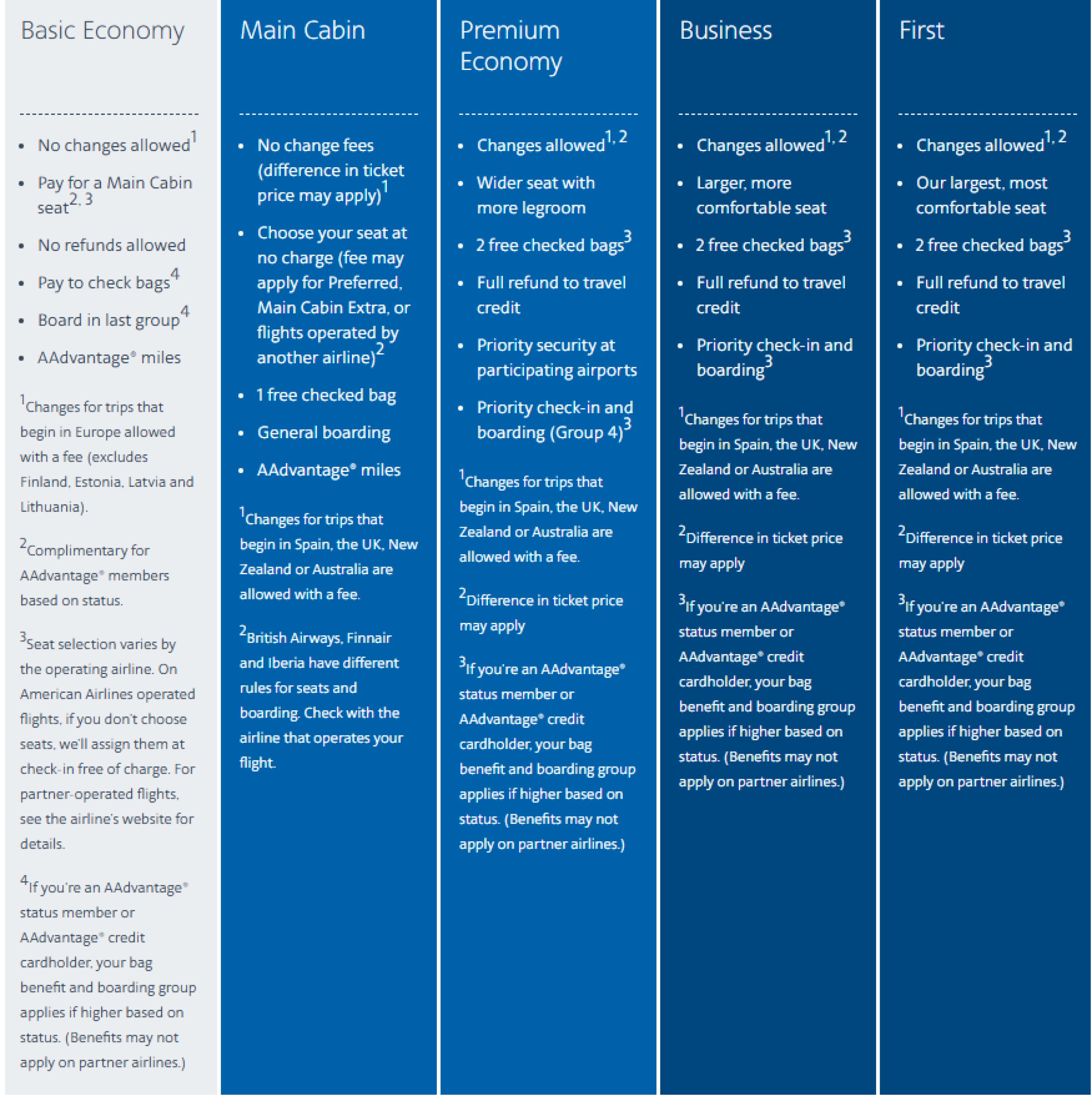 American Airlines bietet in ihren Flugzeugen Economy, Premium Economy, Business und First Class an.