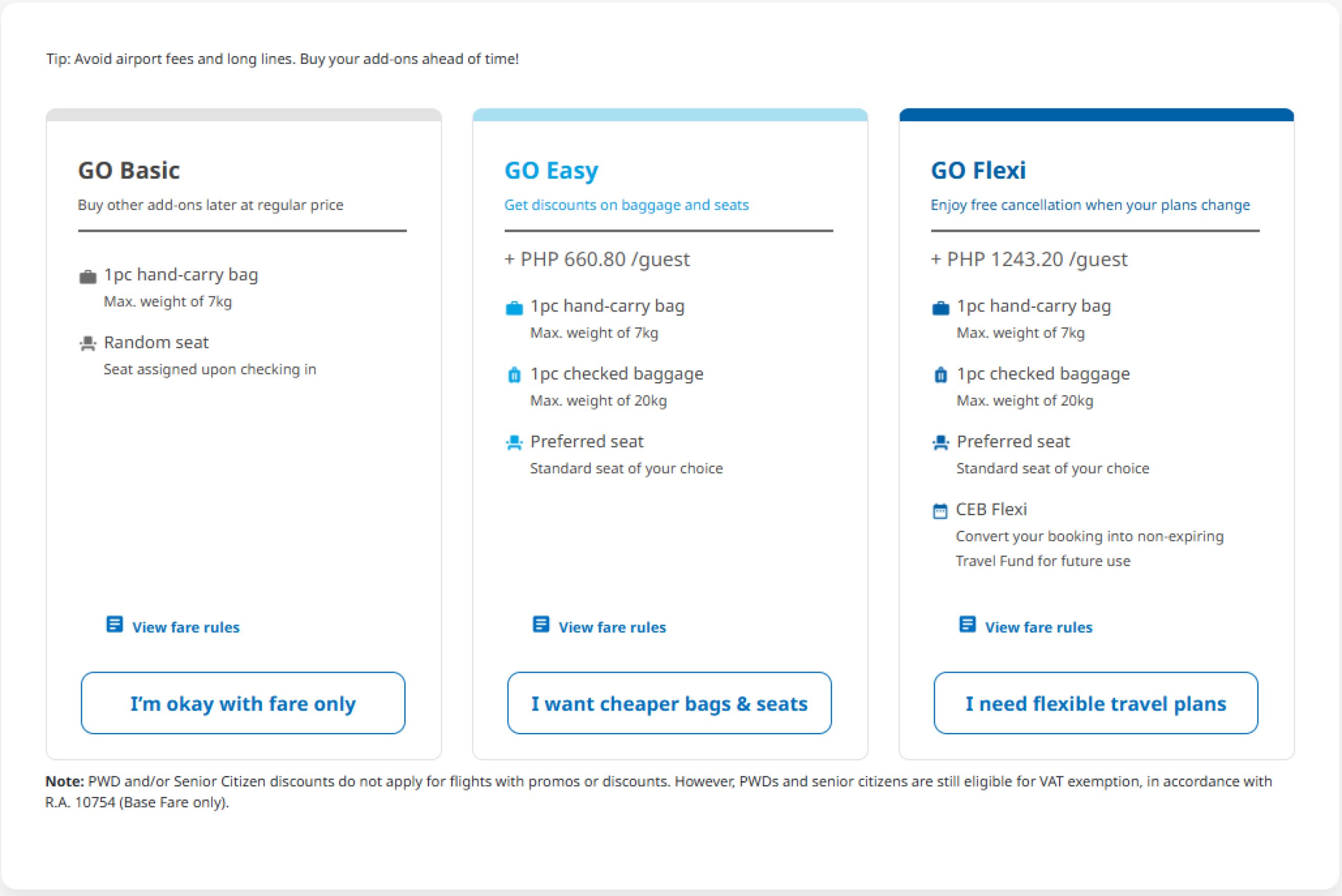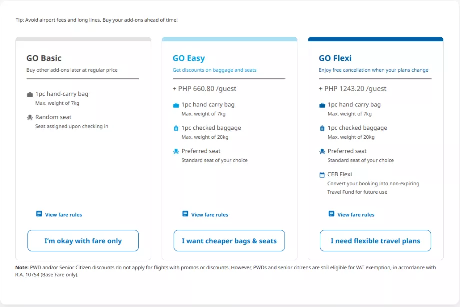 - GO Flexi - Kostenloses aufgegebenes Gepäck (20 kg) und Handgepäck, freie Sitzplatzwahl, kostenlose Stornierung (das Geld wird als Guthaben für die zukünftige Nutzung bei Cebu Pacific erstattet)