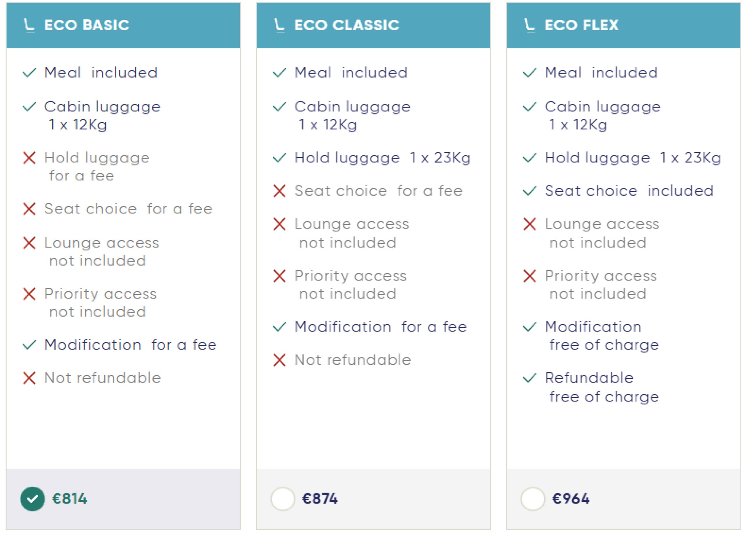 Wenn Sie einen Flug auf flycorsair.com buchen, haben Sie immer die Wahl zwischen 3 verschiedenen Paketen der Economy Class und 2 Paketen der Premium Class.