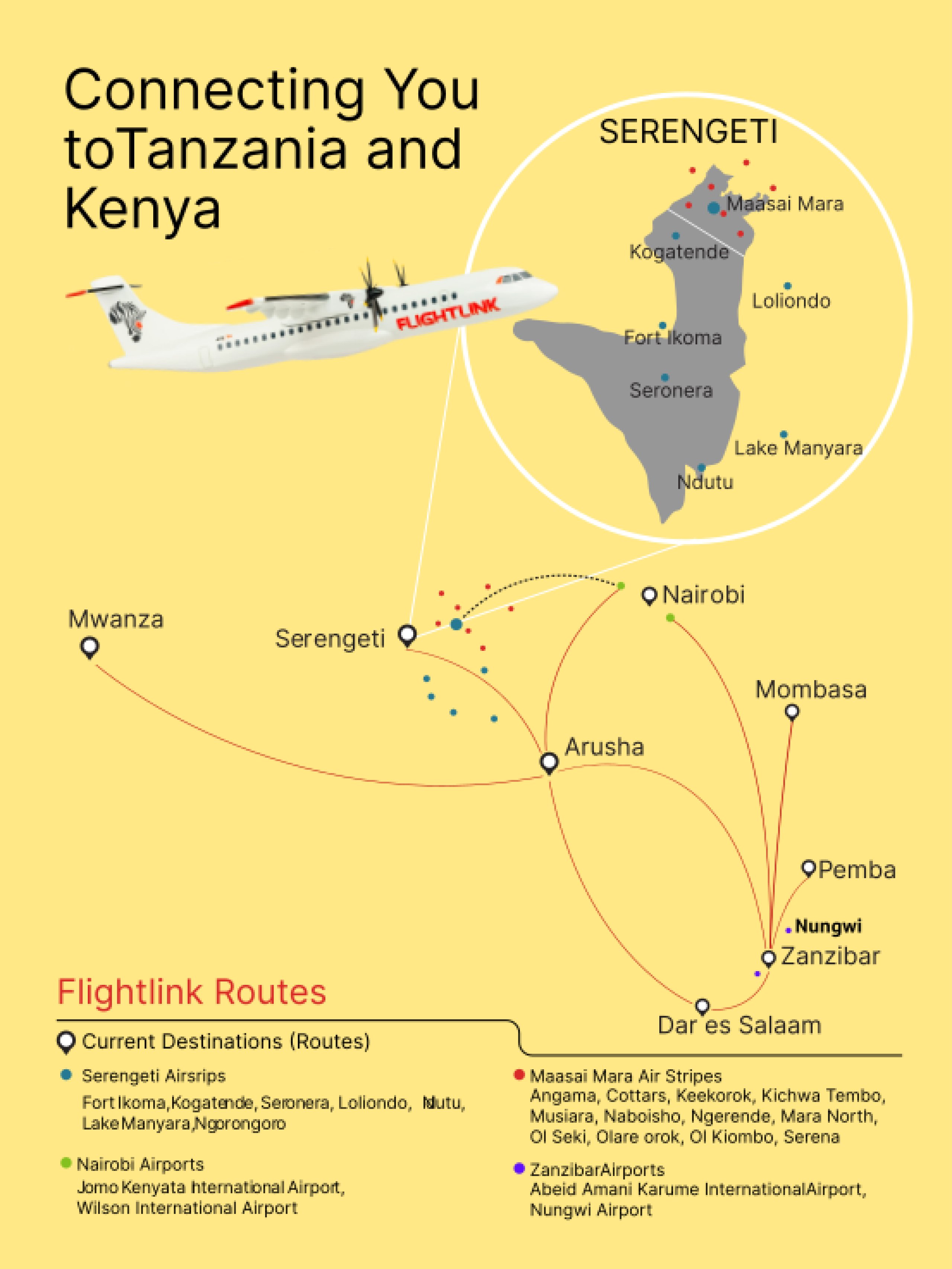 Sie verbindet diese Ziele hauptsächlich mit Landeplätzen in Safari-Nationalparks und mit der Insel Sansibar.