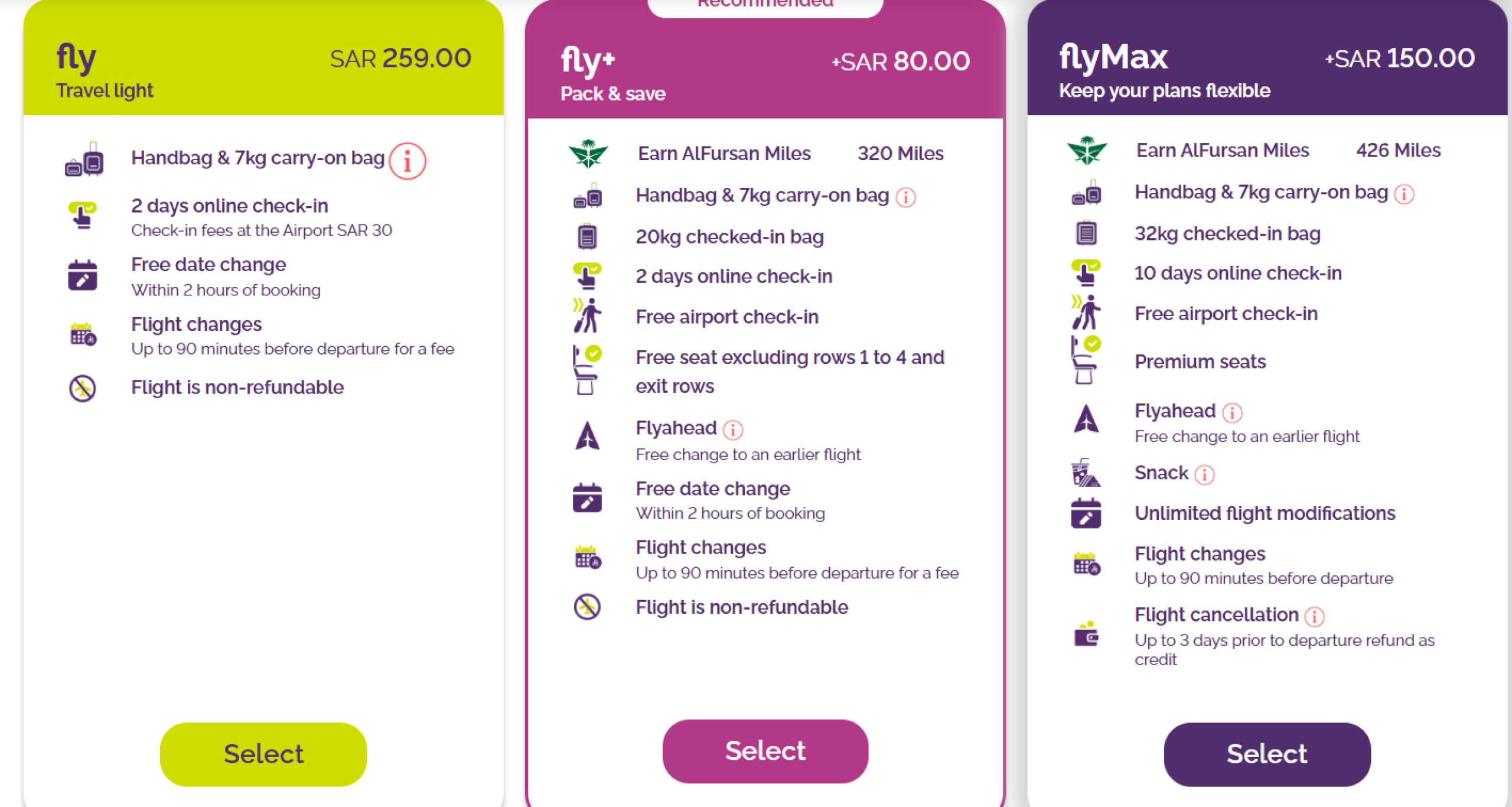 Flyadeal bietet nur die Economy-Klasse an, die in 3 verschiedene Tarifgruppen unterteilt ist.