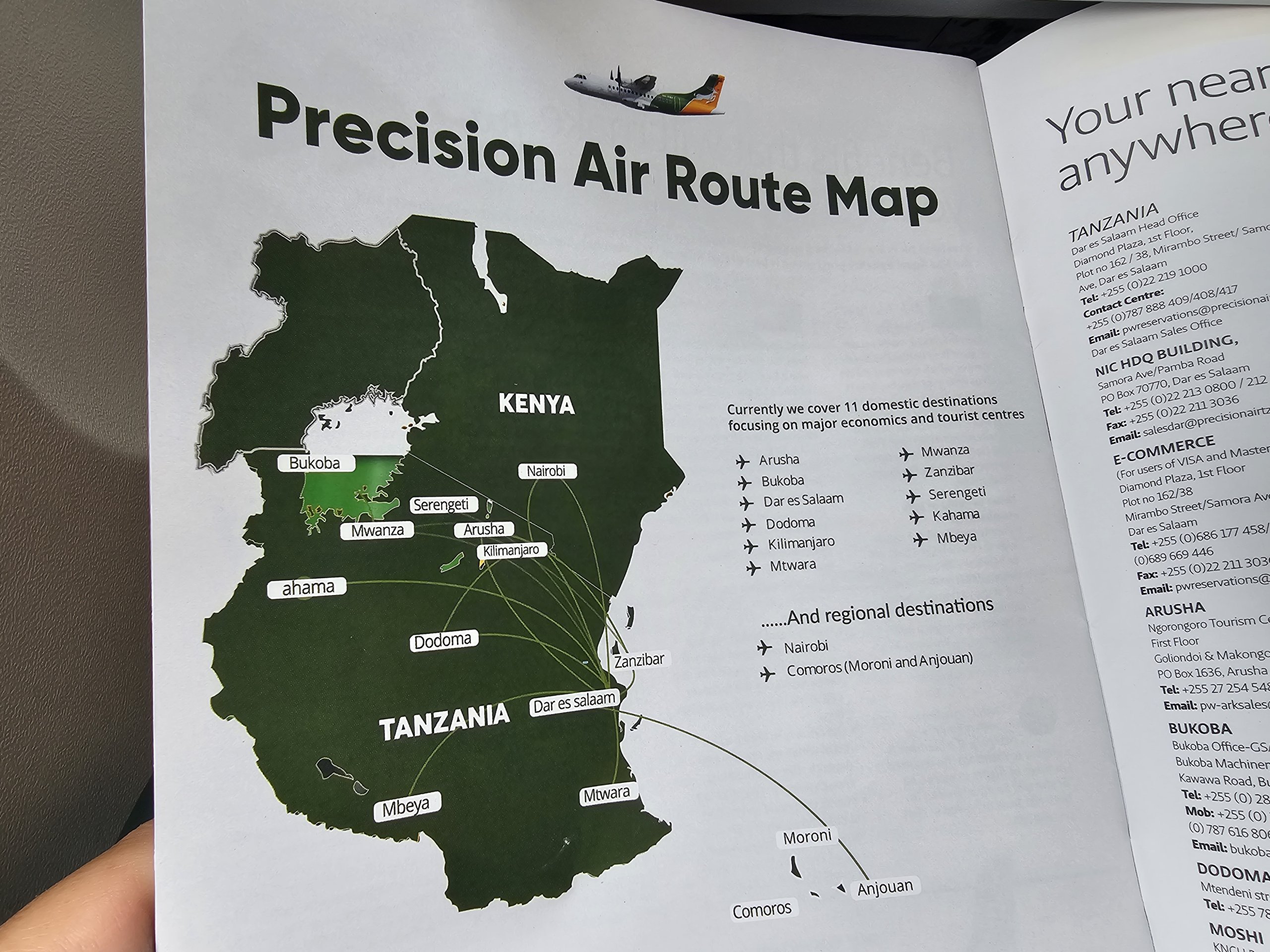 Precision Air ist eine Netzwerkfluggesellschaft, die Anschlussflüge über die Flughäfen Dar es Salaam DAR oder Kilimanjaro JRO oder Sansibar ZNZ.