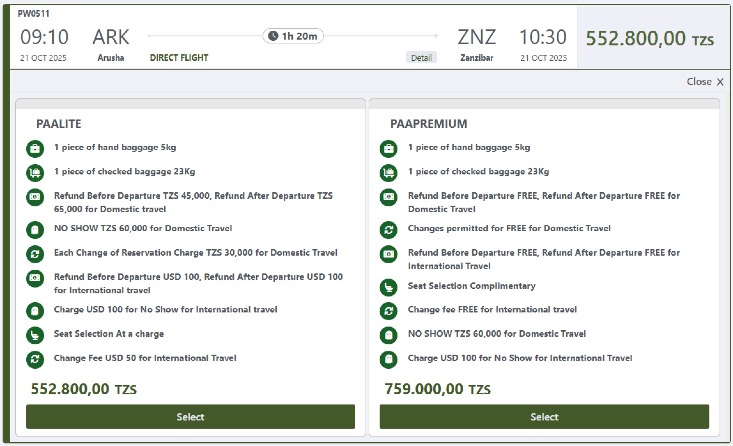 Da Precision Air auf vielen Strecken in Tansania mit anderen Fluggesellschaften konkurriert, lohnt es sich, die Preise über Flugvergleichsrechner zu vergleichen.