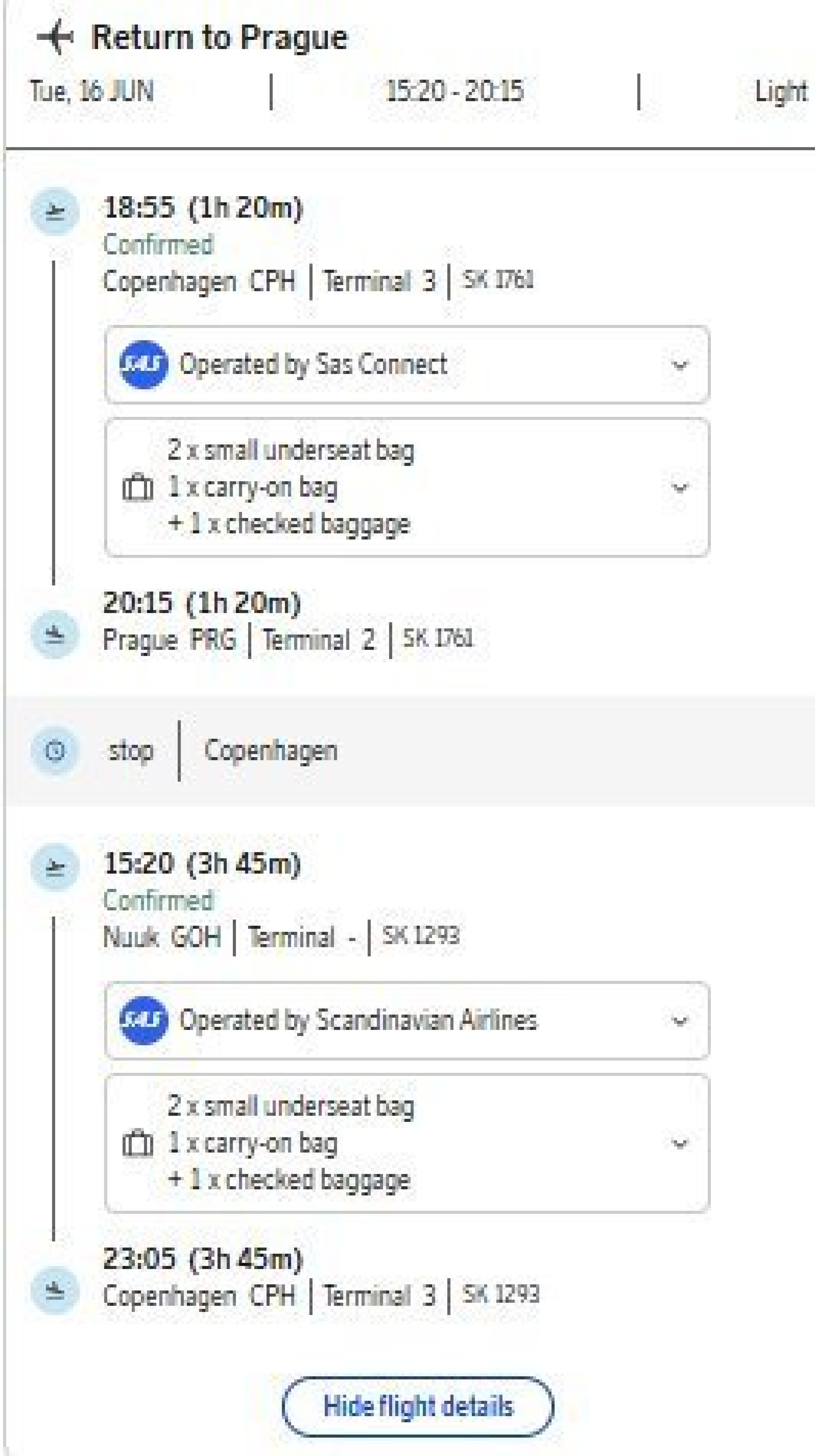 Am 16. Juni gibt es derzeit einen Flug von GOH nach CPH um 15:20 Uhr, der um 23:05 Uhr landet, so dass Sie an diesem Tag den Flug nach Prag nicht erreichen können, da dieser um 18:55 Uhr startet.