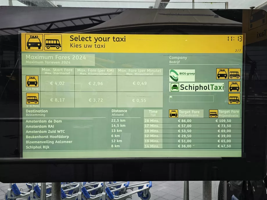 Die aktuellen Tarife sind angeschlagen und die Fahrer fahren streng nach Taxameter. Man kann nur mit Karte bezahlen und die Fahrt ins Zentrum von Amsterdam kostet etwa 60 Euro.