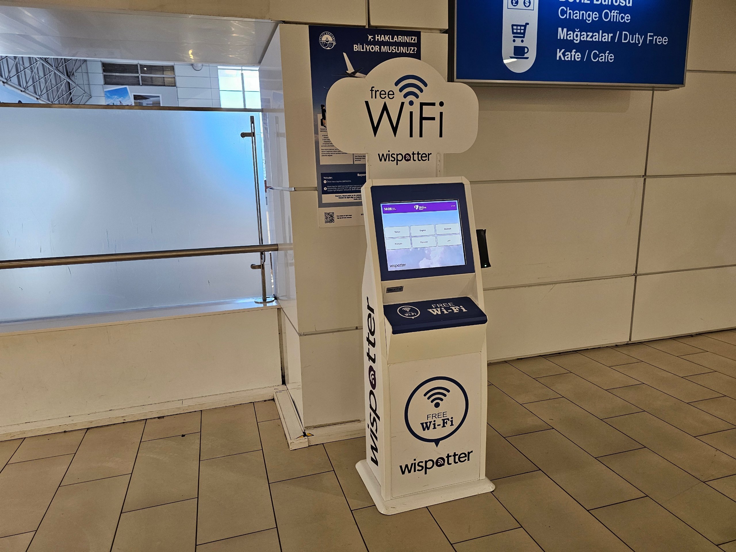 Freies WLAN ist nur für 60 Minuten verfügbar. Das Passwort erhalten Sie nur an den offiziellen Kiosken im gesamten Flughafen, wo Sie entweder eine echte Telefonnummer eingeben oder Ihren Reisepass scannen müssen.