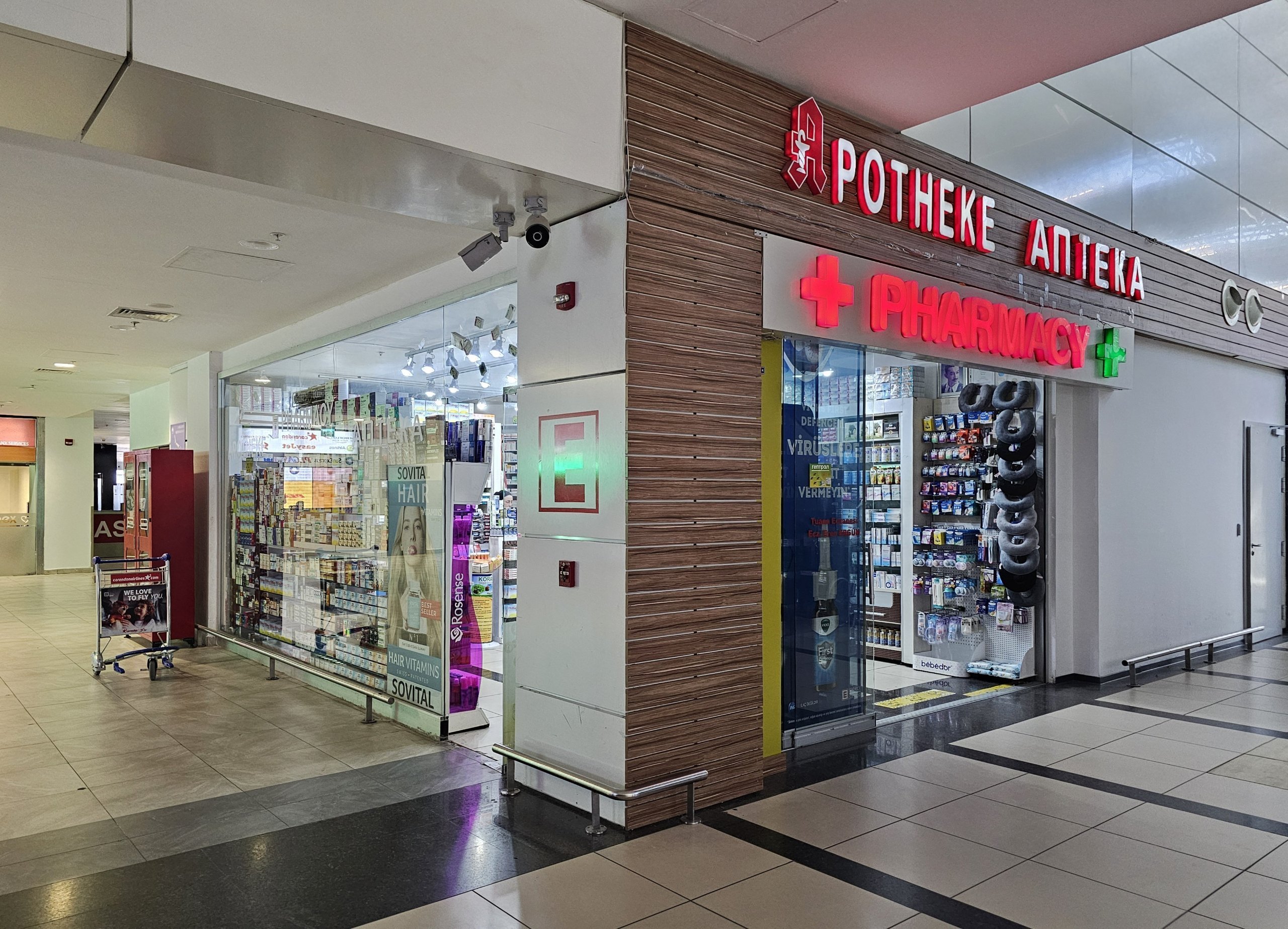 Apotheken finden Sie in den öffentlichen Bereichen beider Terminals (im Terminal 1 rund um die Uhr geöffnet, im Terminal 2 von 9:00 bis 18:00 Uhr).