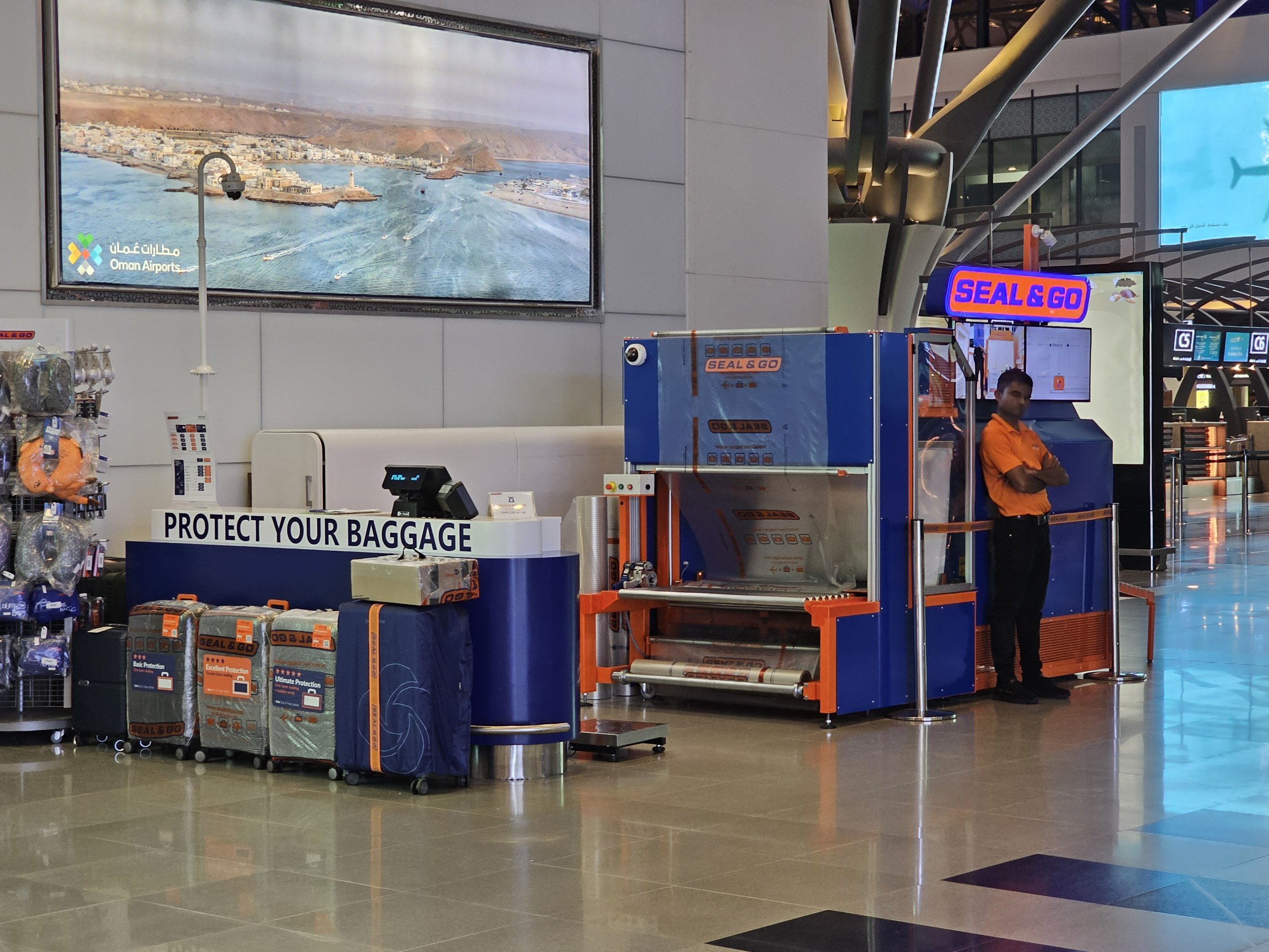 In der Abflughalle gibt es mehrere Kioske, an denen Sie Ihr Gepäck gegen eine Gebühr von 3 omr bis 6 omr (je nach Größe des Koffers) in Schutzfolie einpacken lassen können.