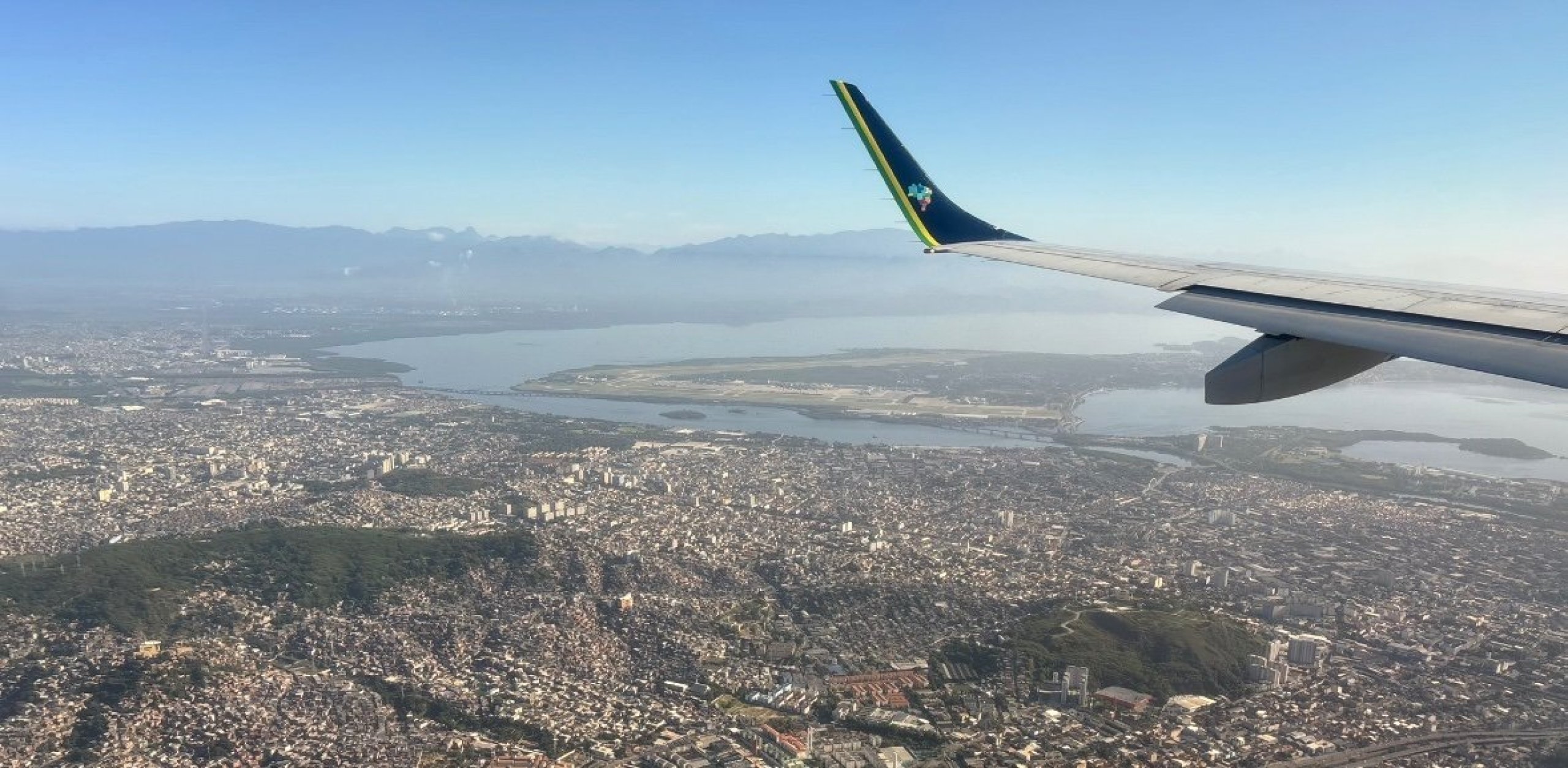Ein Blick auf den Flughafen Galeão auf der Ilha do Governador während eines GRU-SDU-Flugs in einer Embraer-195 von Azul Linhas Aéreas.