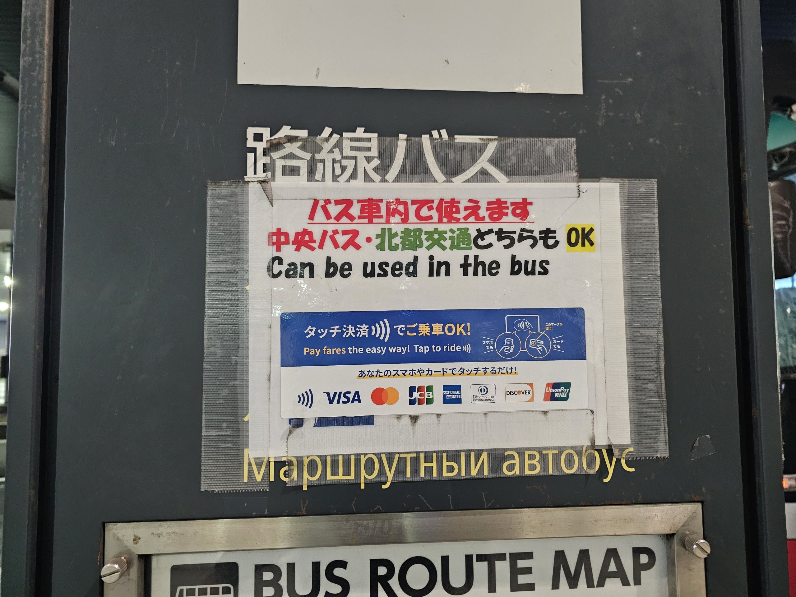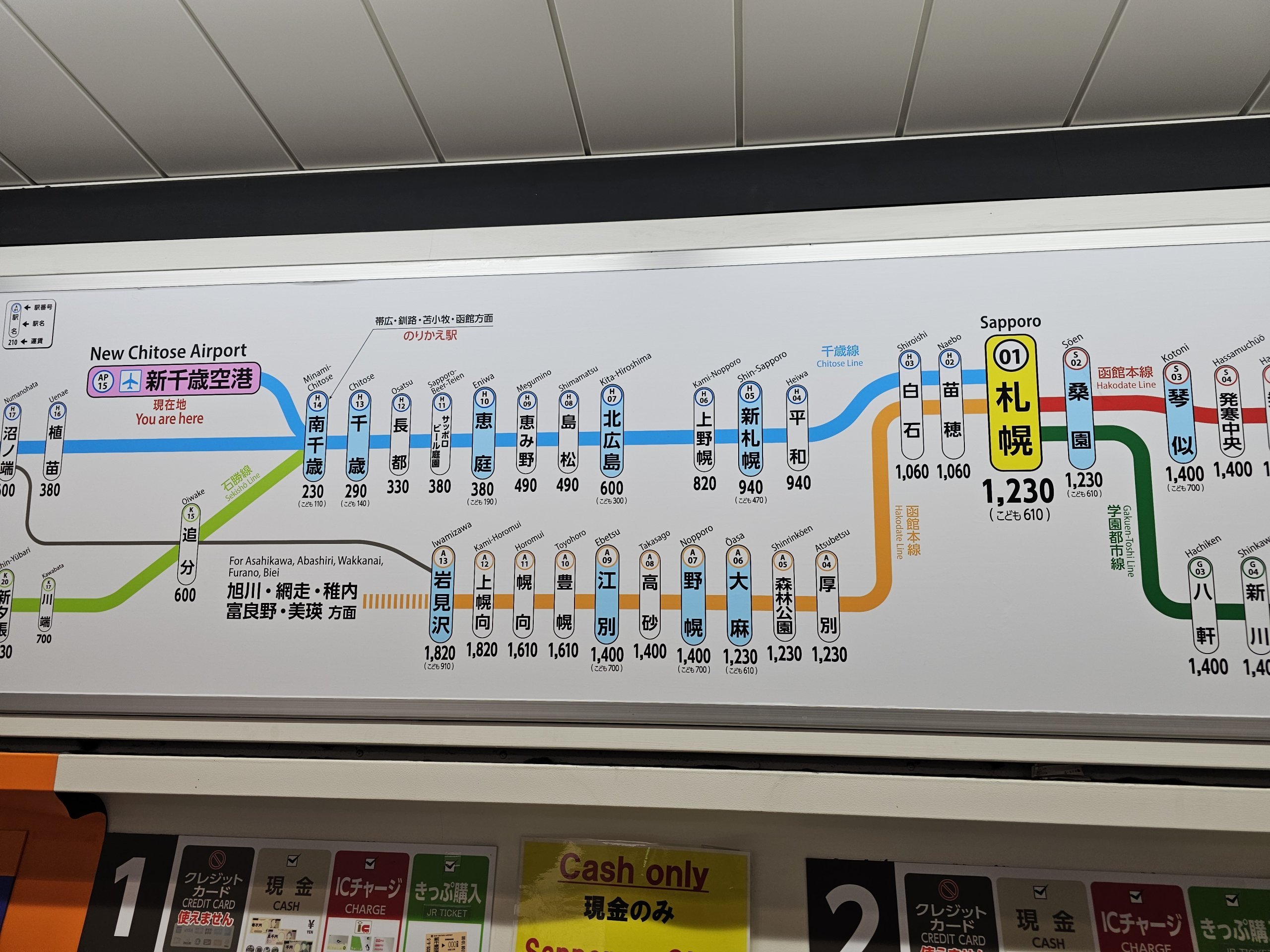 Alternativ können alle japanischen IC-Karten zum Bezahlen verwendet werden - wenn Sie eine von anderen Reisen nach Japan haben, brauchen Sie sich um nichts zu kümmern, stecken Sie sie einfach an das Drehkreuz. Wenn Sie eine Kitaca-Karte kaufen möchten, brauchen Sie ebenfalls nur Bargeld.