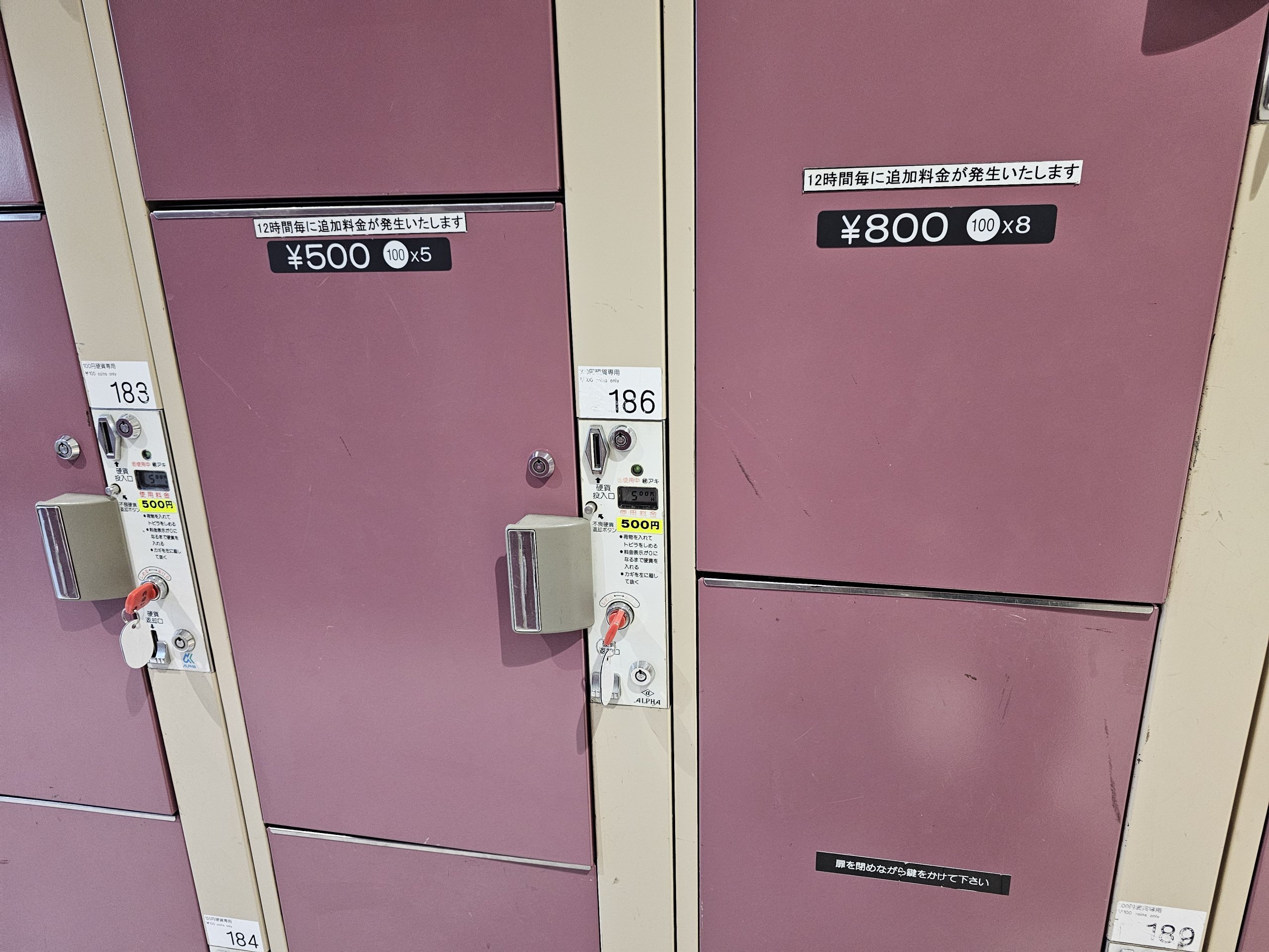 Die Preise sind nach Schließfachgröße gestaffelt und reichen von 500 JPY bis 800 JPY.