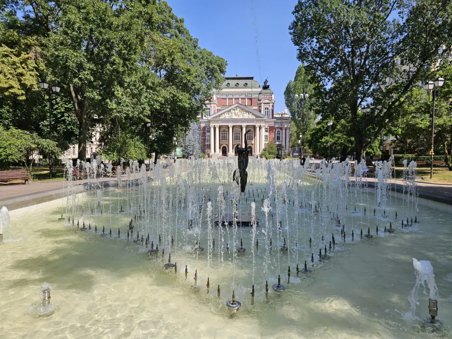 Vor dem Theater befindet sich ein schöner Stadtpark mit einem Springbrunnen.
