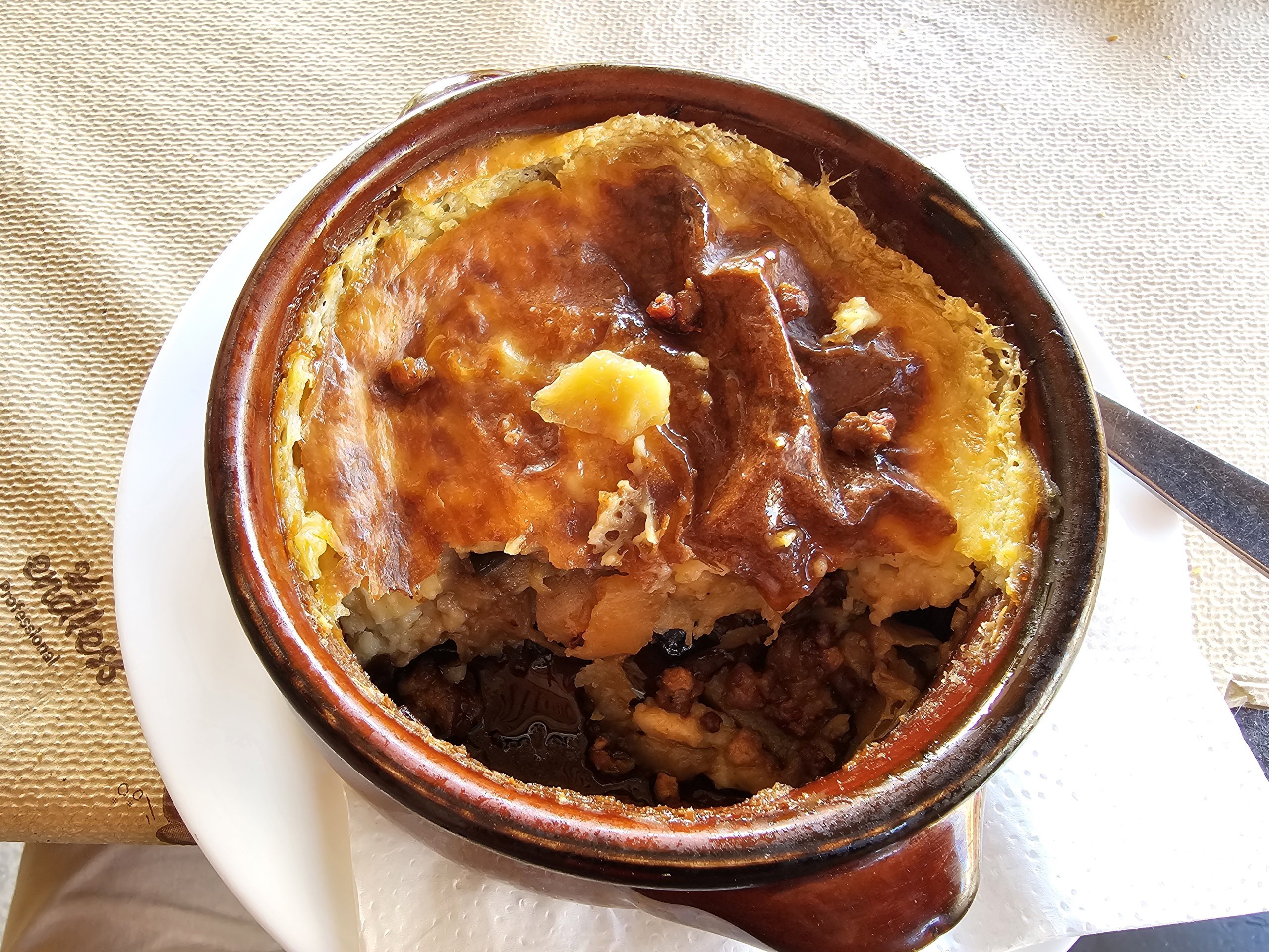 Musaka - eines der berühmtesten griechischen Gerichte, oft auch "Balkan-Lasagne" genannt. Es besteht aus mehreren Schichten gebackener Auberginen (selten eine Schale mit Zucchini-Auberginen), die mit Lammfleisch gefüllt und mit einer Bechamelsauce übergossen werden.