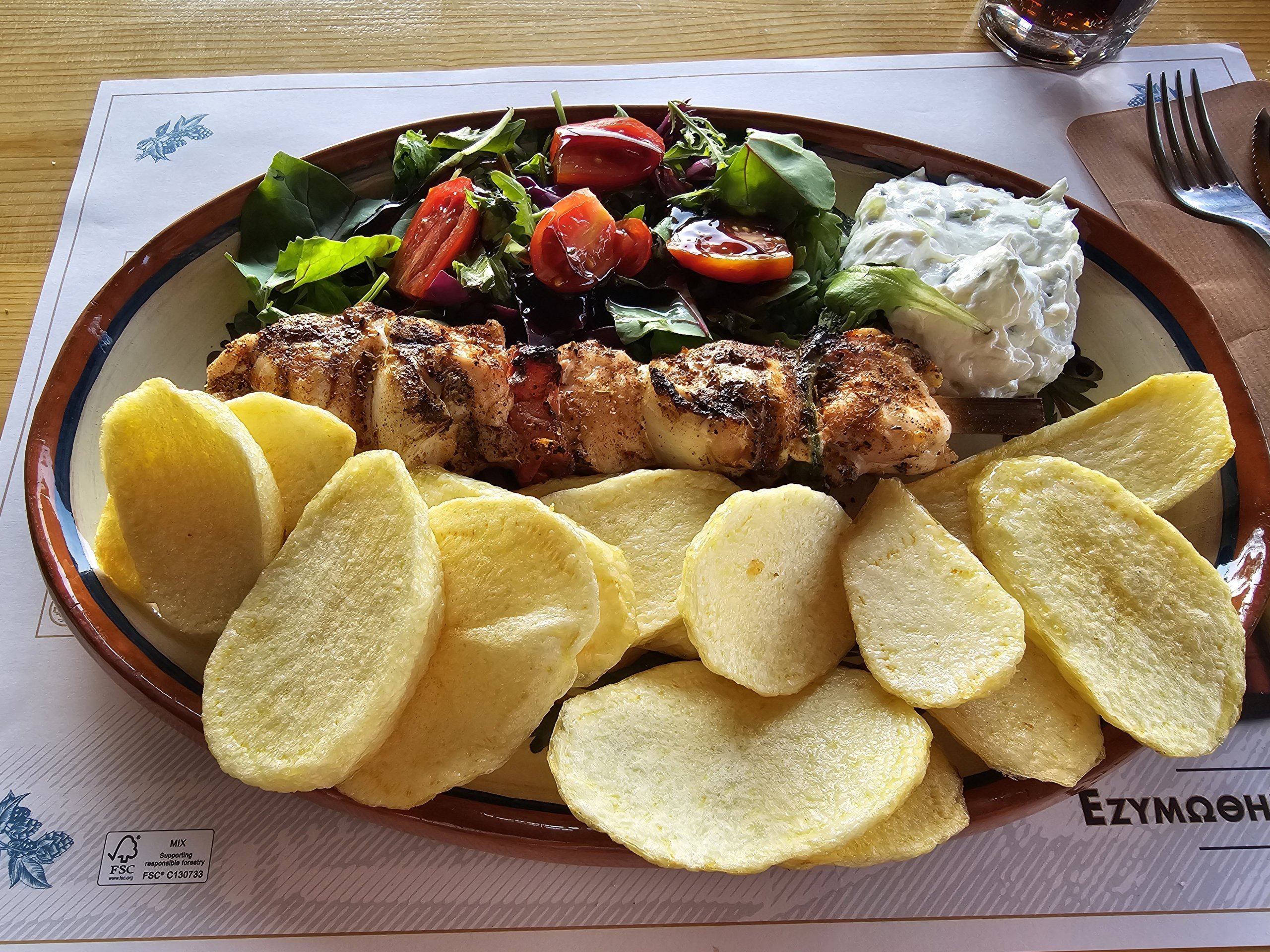 Souvlaki - nach Gyros wahrscheinlich das beliebteste griechische Fastfood, oder vielmehr das Essen, das man jederzeit und überall bekommen kann, von den besseren Restaurants bis zu den heruntergekommensten Imbissbuden.