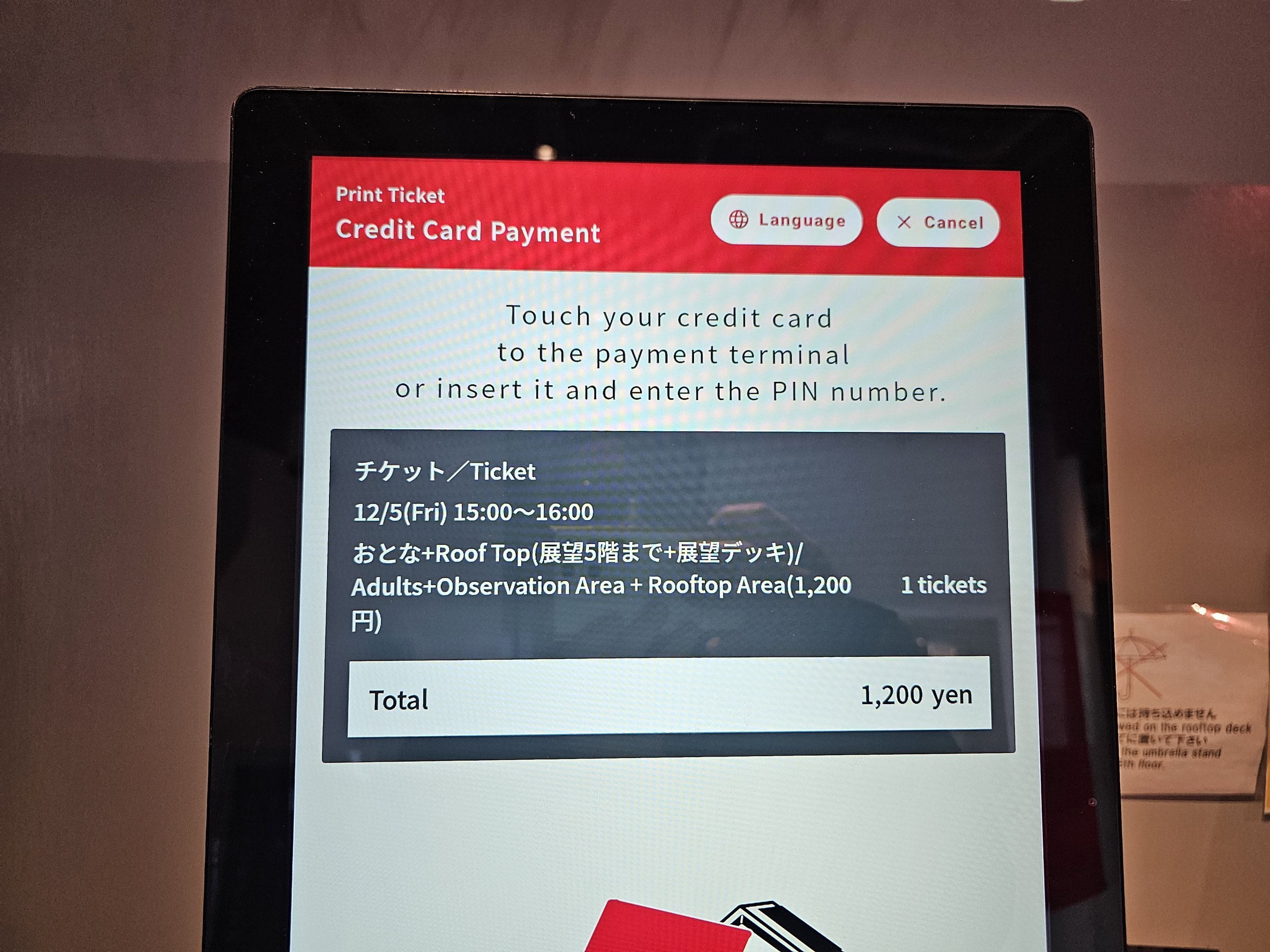 Die Tickets können am Ticketautomaten mit einer Kreditkarte oder einer japanischen IC-Karte gekauft werden. Bargeld wird nicht akzeptiert.