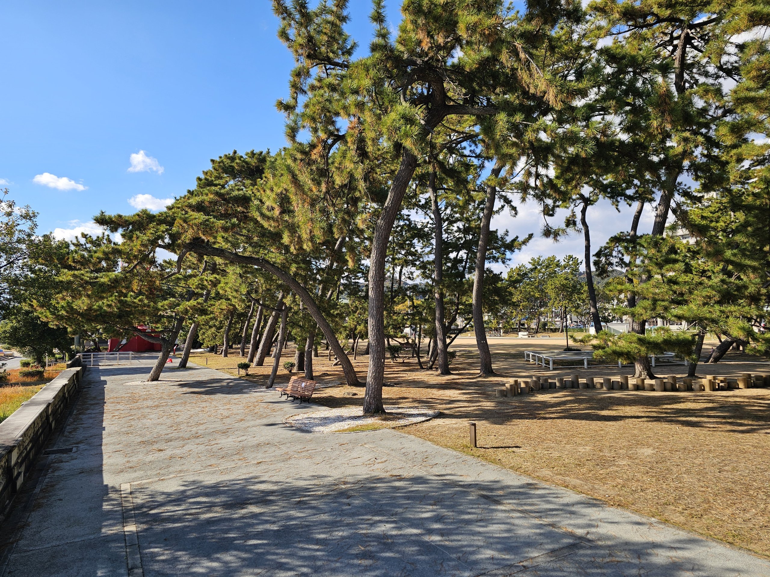 Dafür gibt es viel Platz, schöne Ausblicke auf die Küste und, bei guter Sicht, auf die Akashi Kaikyō-Brücke.