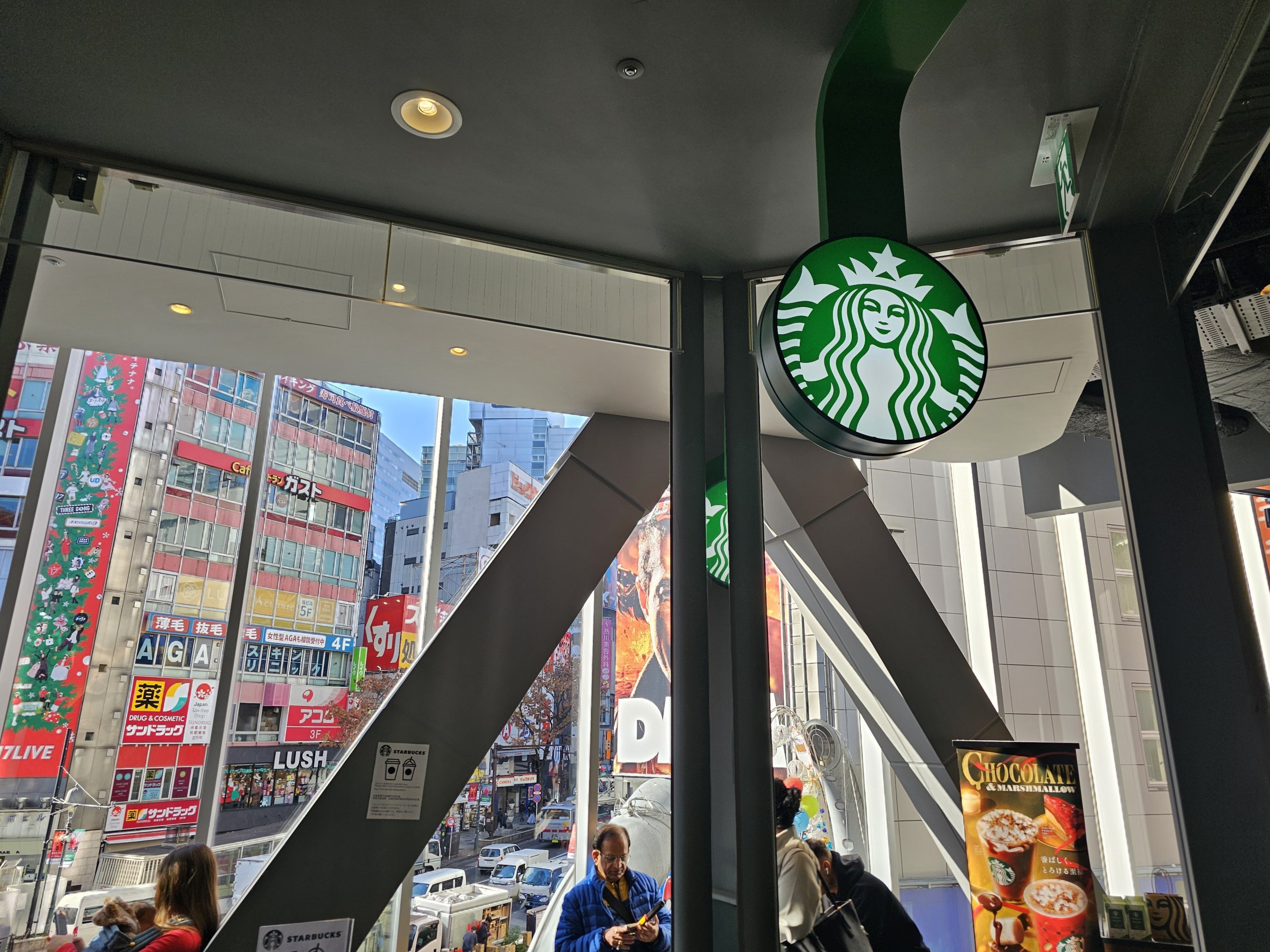Von hier aus hat man einen schönen Blick auf die Scramble-Kreuzung, aber auch wenn die Aussichtsplattform draußen ist, ist das Glas hoch, so dass man ohne Glas sowieso keine klare Sicht hat.