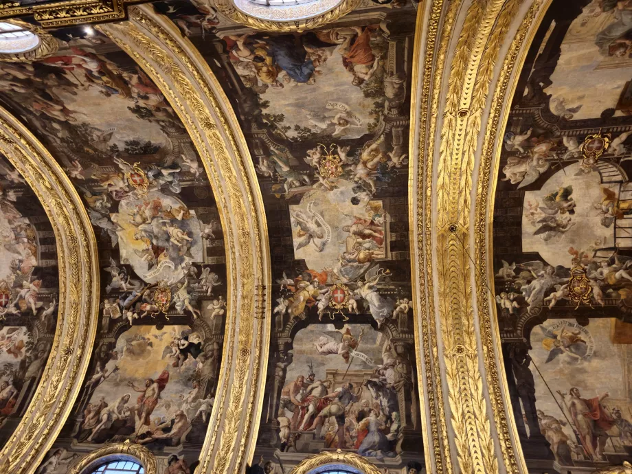 Die bemerkenswerten Gemälde werden durch reiche Goldverzierungen und Marmorsäulen und -böden ergänzt.