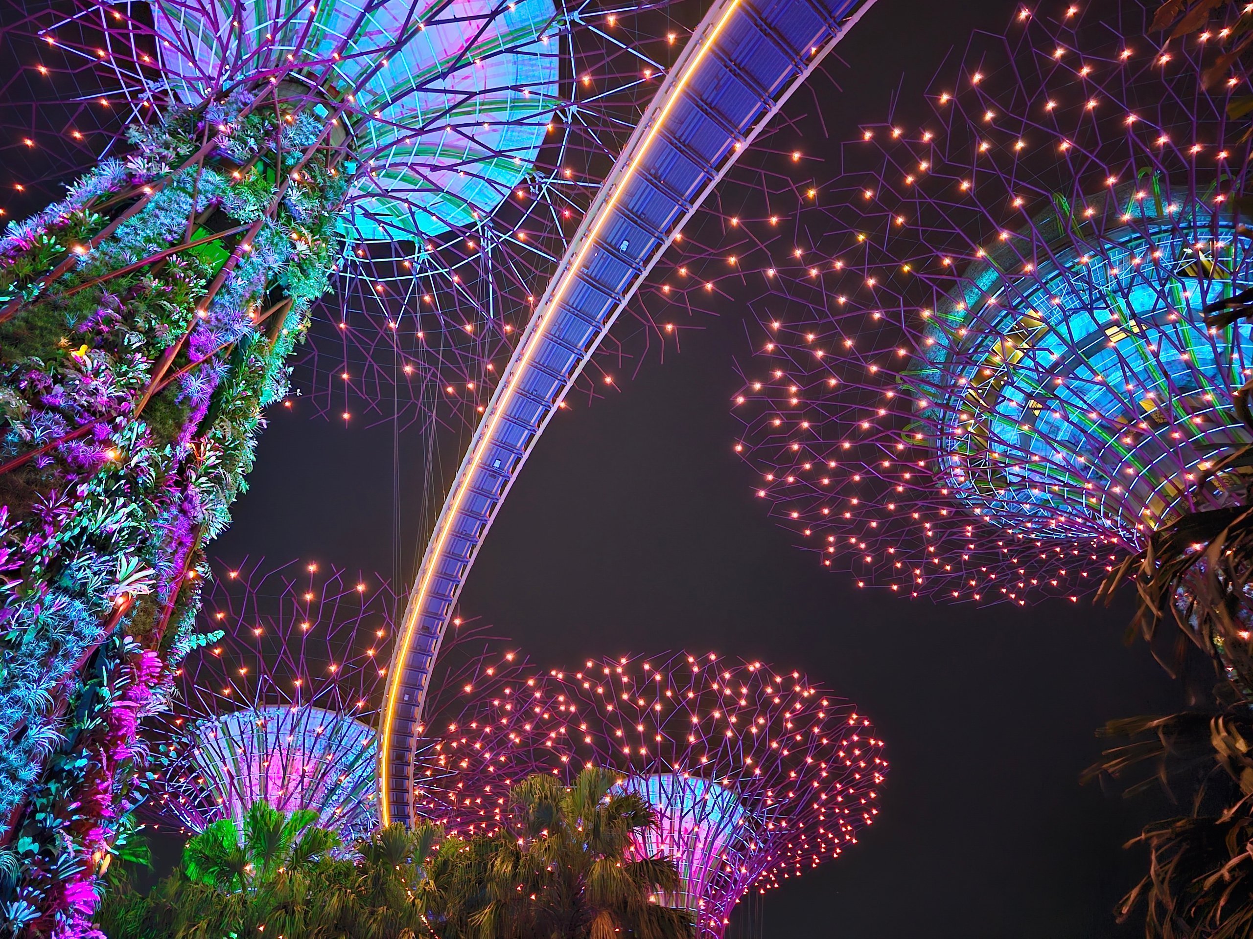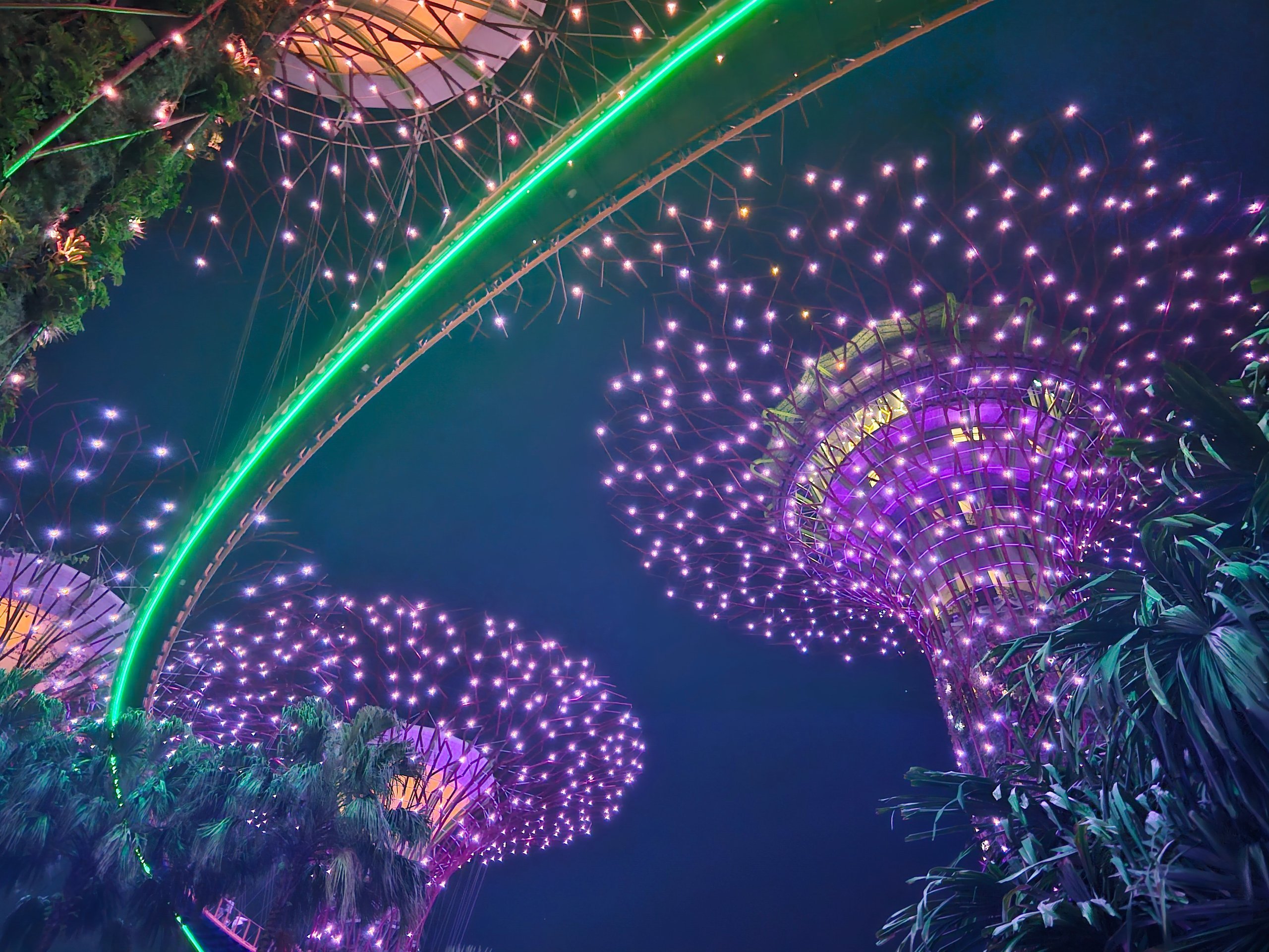 Jeden Tag findet die Licht- und Musikshow Garden Rhapsody inmitten der Supertrees statt. Die Bäume leuchten allmählich auf, wechseln die Farben und das Ganze funktioniert viel besser, als man es allein von den Fotos her vermuten würde.