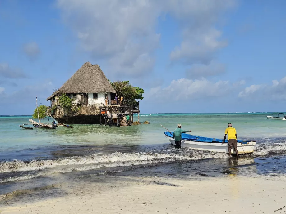 Das Restaurant The Rock ist eine ikonische Attraktion nicht nur für Sansibar, sondern für ganz Tansania. Das kleine, märchenhaft aussehende Haus steht auf einem Felsen mitten im Ozean, etwa 50 Meter vom Ufer entfernt, und auf den ersten Blick würde man kaum vermuten, dass sich im Inneren eines der luxuriösesten Restaurants Sansibars befindet. [btn "Die 10 besten Hotels auf Sansibar" https://www.booking.com/region/tz/zanzibar.en.html?aid…