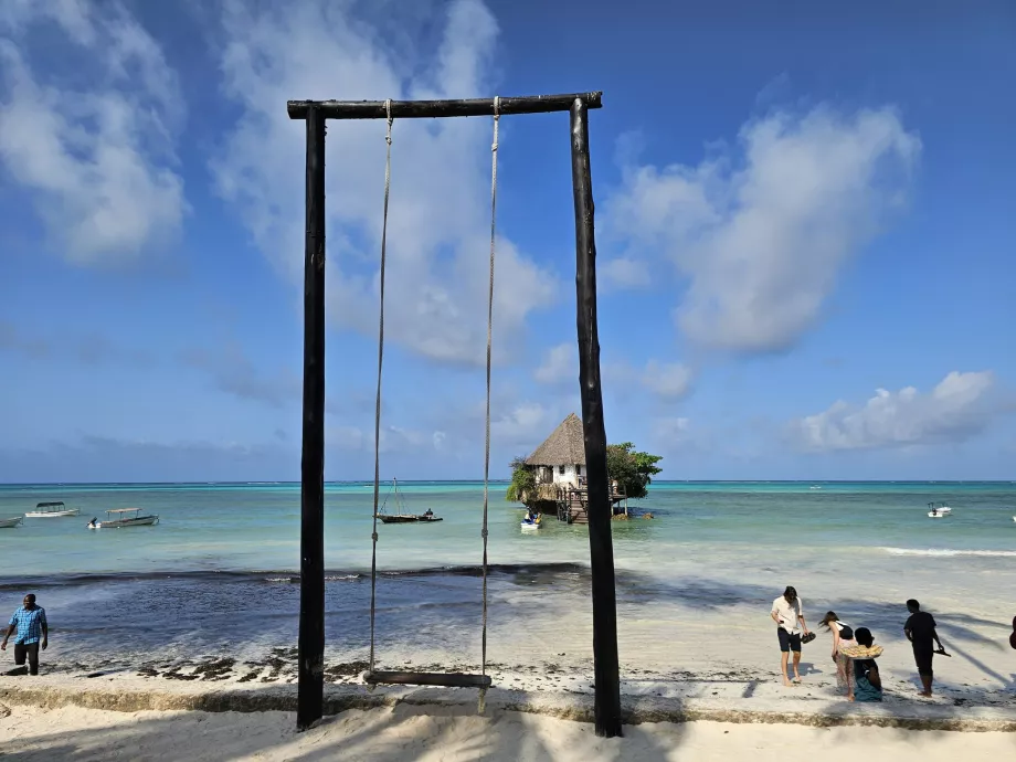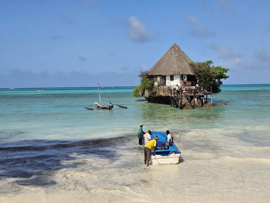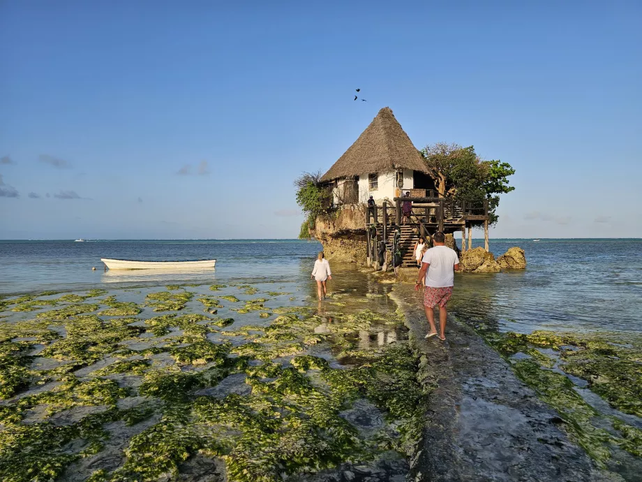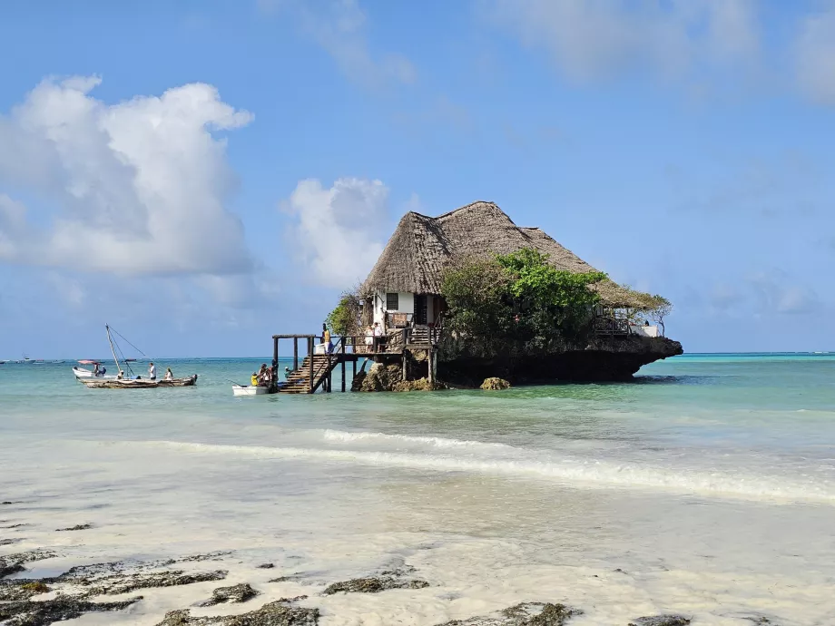 Das kleine, märchenhaft aussehende Haus steht auf einem Felsen mitten im Ozean, etwa 50 Meter vom Ufer entfernt, und auf den ersten Blick würde man kaum vermuten, dass sich im Inneren eines der luxuriösesten Restaurants Sansibars befindet.