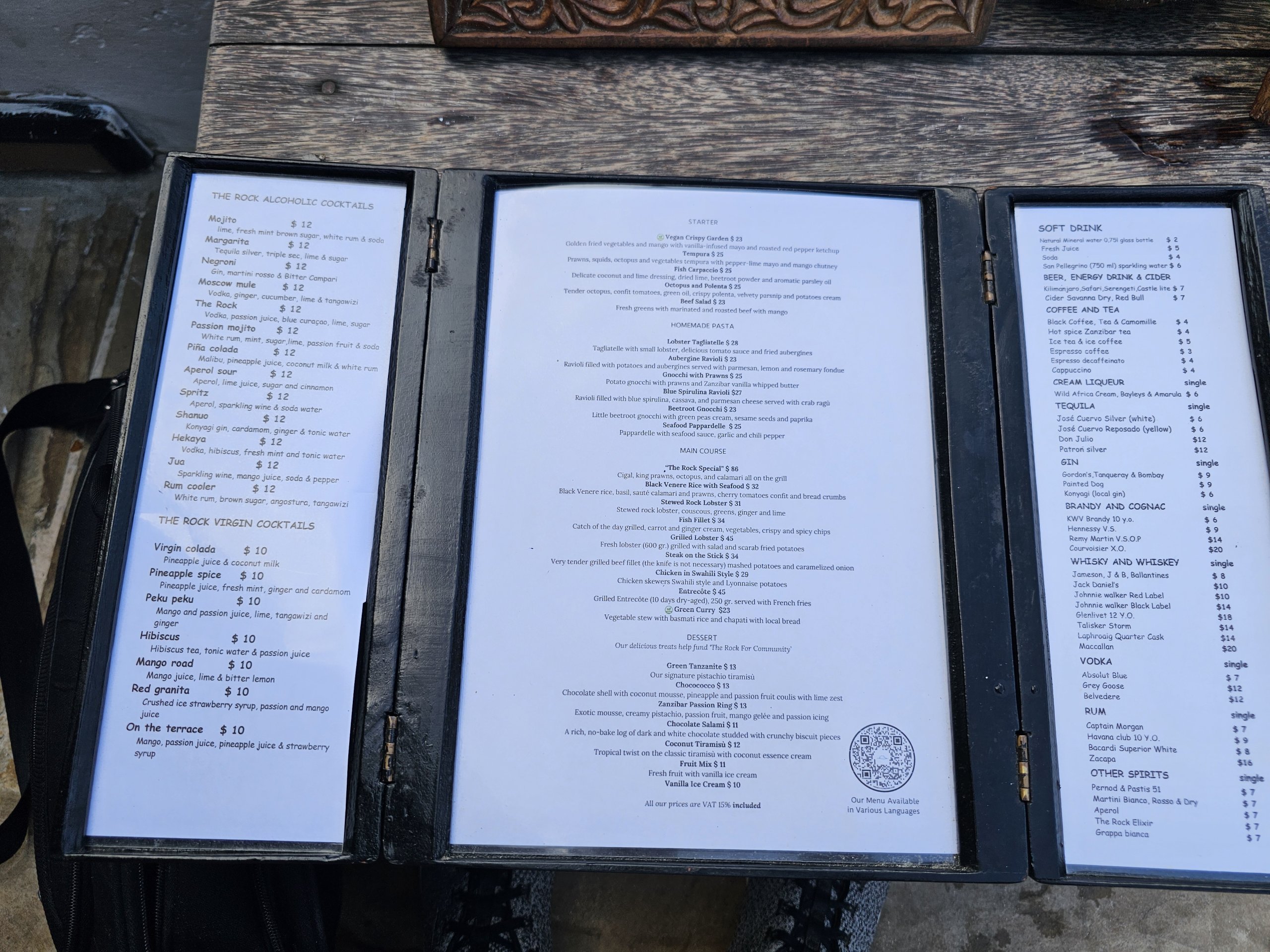 Die vollständige Speisekarte kann auf der Website des Restaurants eingesehen werden: therockrestaurantzanzibar.com.