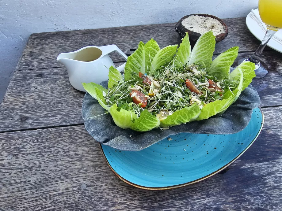 Als Vorspeise wählte ich einen lokalen Salat mit Sesam und Brot. Er war großartig!