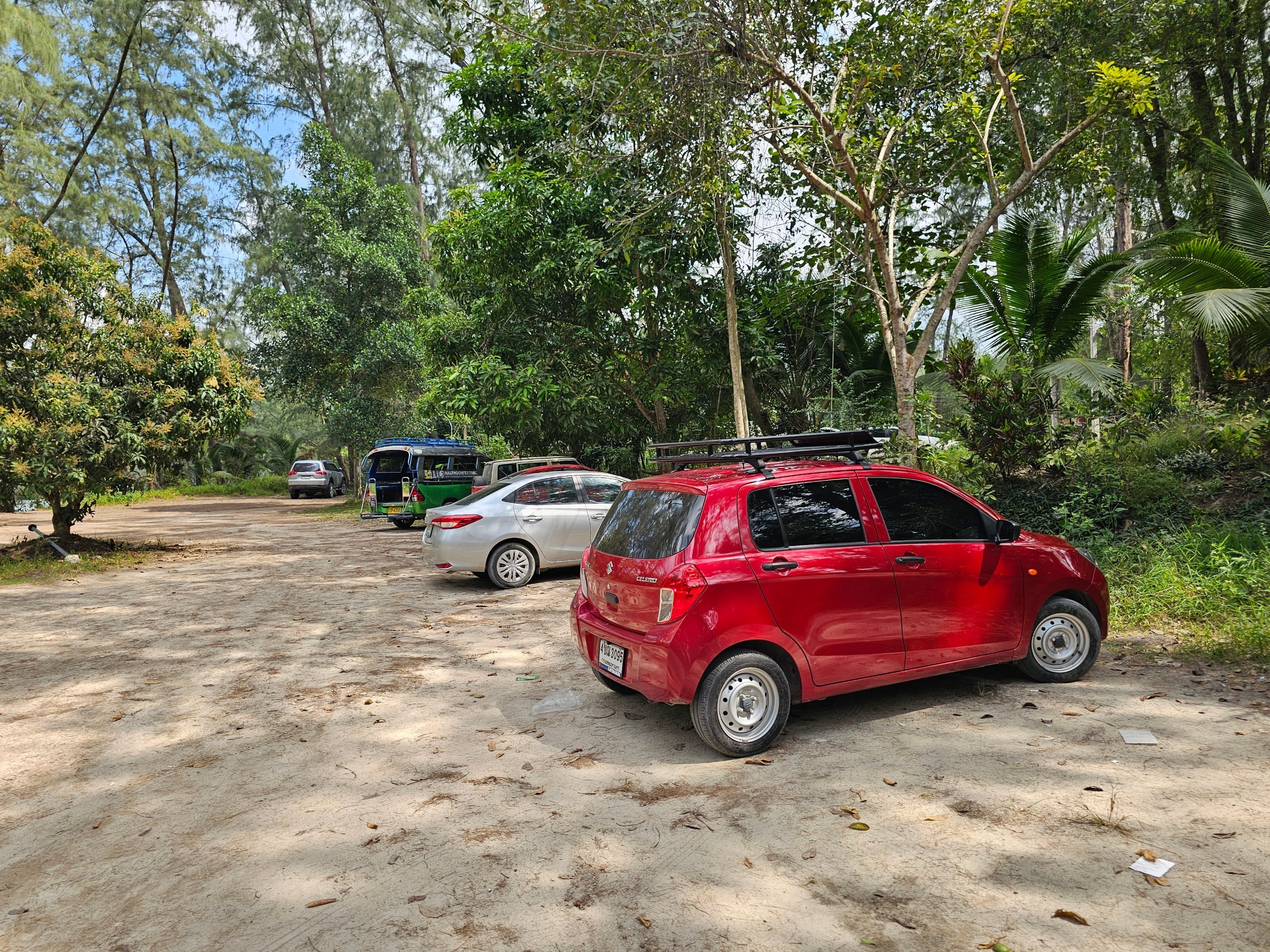 Von der Hauptstraße führt ein Schotterweg fast bis zum Strand. Es gibt einen großen kostenlosen Parkplatz, der für Motorroller und Autos geeignet ist.