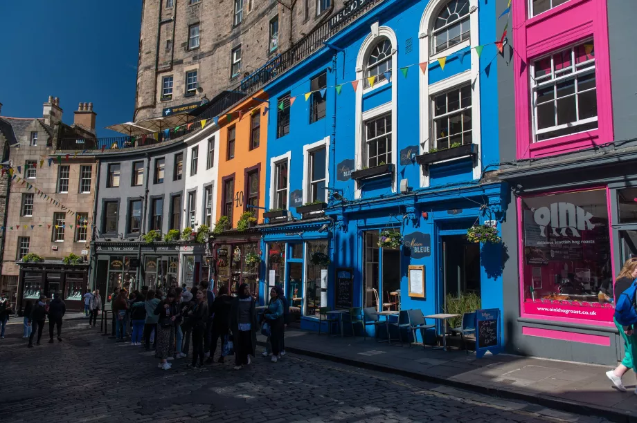 - Vom Grassmarket: Die Straße beginnt an der rechten Ecke des Platzes, wo sich die charakteristischen bunten Häuser befinden.